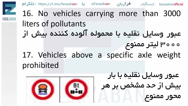در این درس آموزش زبان انگلیسی از گروه فرازبان به آموزش تصویری علائم و تابلو های راهنمایی و رانندگی را به زبان انگلیسی می پردازیم.