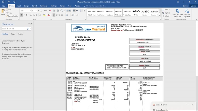 MALAYSIA BANK MUAMALAT BANK ACCOUNT STATEMENT, WORD AND PDF