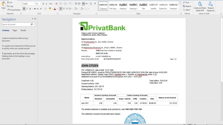 UKRAINE PRIVATBANK BANK STATEMENT TEMPLATE IN WORD AND PDF F