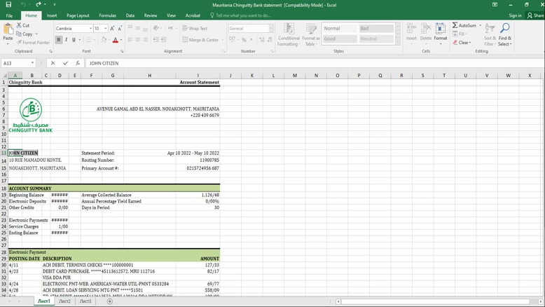 MAURITANIA CHINGUITTY BANK STATEMENT EXCEL AND PDF TEMPLATE | Editable bank Statement template | 3 month bank statement generator | 3 month bank statement generator |