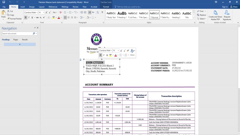 PAKISTAN MEEZAN BANK STATEMENT TEMPLATE IN WORD AND PDF FORMAT | Editable bank Statement template | 3 month bank statement generator | 3 month bank statement generator |