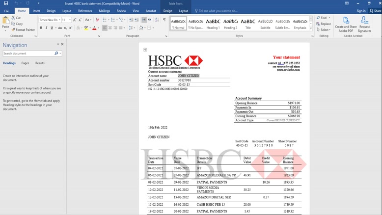 FAKE BRUNEI HSBC PROOF OF ADDRES STATEMENT TEMPLATE