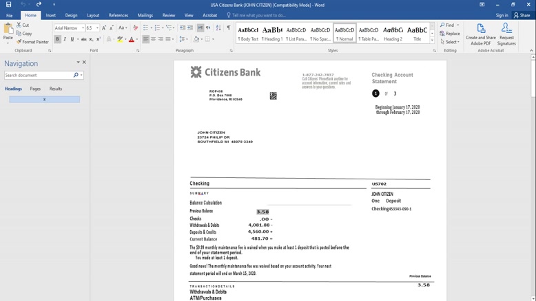 USA CITIZENS BANK STATEMENT TEMPLATE IN WORD AND PDF FORMAT, (4 PAGES) GOOD FOR ADDRESS PROVE | Editable bank Statement template | 3 month bank statement generator | 3 month bank statement generator |