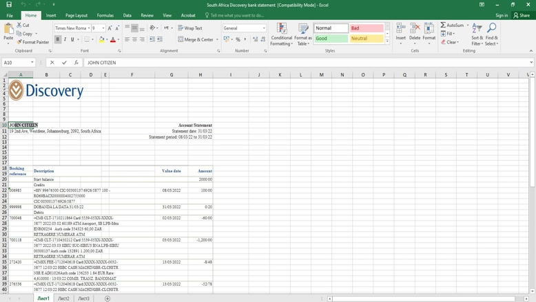SOUTH AFRICA DISCOVERY BANK STATEMENT, EXCEL AND PDF TEMPLATE | Editable bank Statement template | 3 month bank statement generator | 3 month bank statement generator |