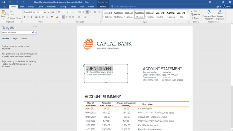 NORTH MACEDONIA CAPITAL BANK BANK STATEMENT TEMPLATE IN WORD