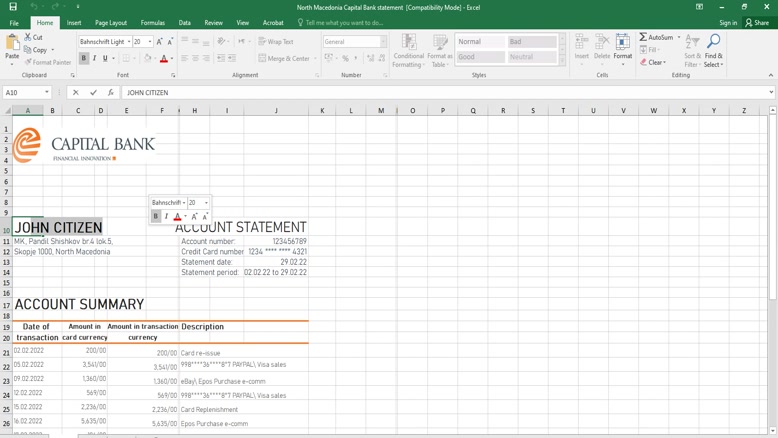 NORTH MACEDONIA CAPITAL BANK BANK STATEMENT TEMPLATE IN WORD