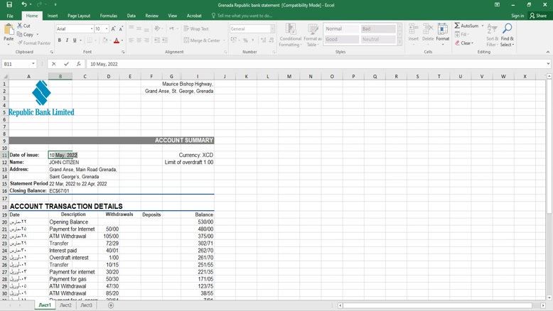 GRENADA REPUBLIC BANK STATEMENT EXCEL AND PDF TEMPLATE