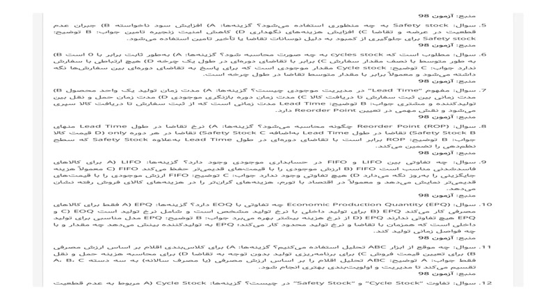 سوال: Safety stock به چه منظوری استفاده میشود؟ گزینهها: A) افزایش سود ناخواسته B) جبران عدم قطعیت در عرضه و تقاضا C) افزایش هزینههای نگهداری D) کاهش امنیت زنجیره تامین جواب: B توضیح: Safety stock برای جلوگیری از کمبود به دلیل نوسانات تقاضا یا تأخیر تامین استفاده میشود.