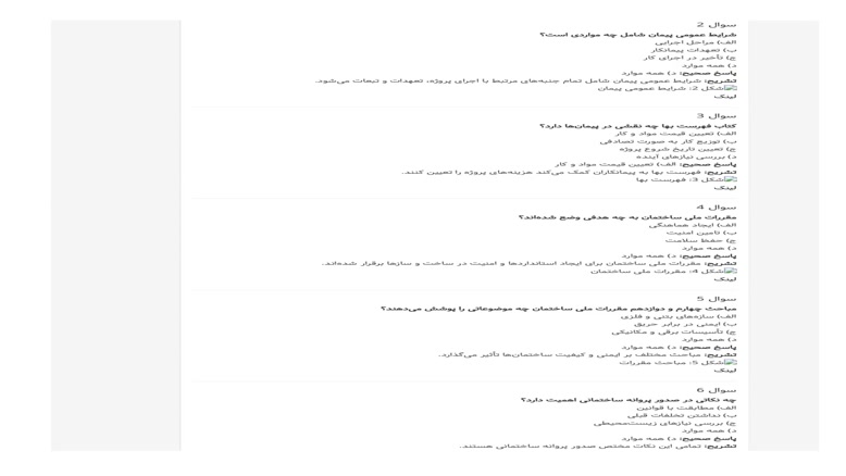 سوالات استخدامی آشنایی با امور قراردادها، شرایط عمومی و خصوصی پیمان و فهرست بها، مقررات ملی ساختمان، صدور پروانه ساختمانی و تخلفات ساخت و ساز