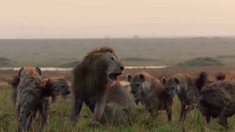 گله کفتار ها به شیر حمله میکنند و زخمیش میکنند تا اینکه یه شیر دیگه از راه میرسه و دوستشو نجات میده!